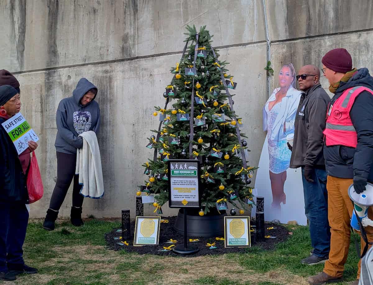 This Monday morning, November 17, BikePGH joined community members and the QCares Foundation for an impactful World Day of Remembrance event along Lysle Blvd in McKeesport. Participants gathered at 8:30am to honor friends, family, and neighbors who have been killed while walking or biking in McKeesport and throughout the region. The centerpiece of the event was a memorial tree decorated with the names of traffic violence victims in the Greater Pittsburgh area and beyond.