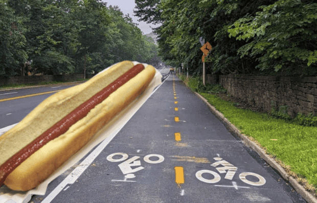 PITTSBURGH, PA – A new way to protect bicyclists is in town, and it is hot and delicious. One passerby remarked, “This reminds me of my favorite hot dogs from BottleDogs by Bottlerocket, oh boy how I love those dawgs.”