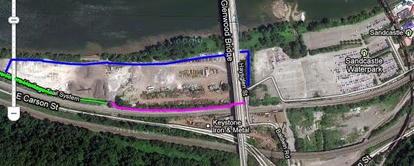 i think they'll develop the corridor between the railroad and keystone metals by retaining the elevated approach (right side of the pink line) to the stone abutment (left side of the pink line), then convey travelers off the abutment via a set of switchback ramps.